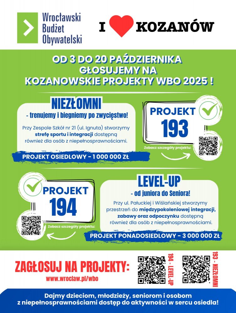 ✅ Głosuj na projekty 193 i 194 – razem dla aktywnego i otwartego Kozanowa!