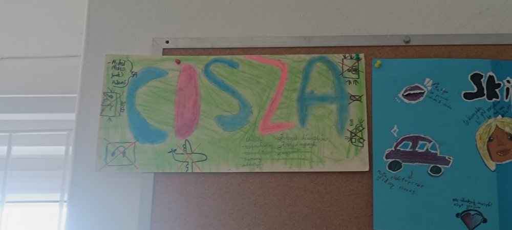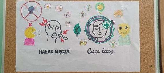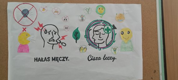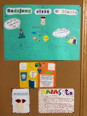 Aby przypominać o tym na co dzień, na terenie szkoły pojawiły się również plakaty promujące ciszę i kulturę zachowania, przygotowane w ramach projektu.