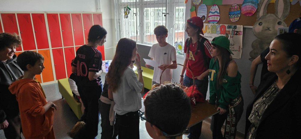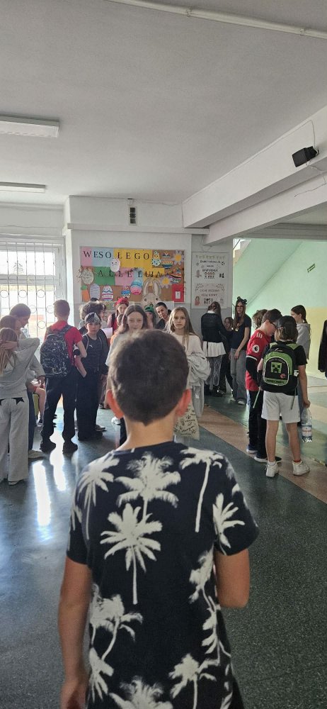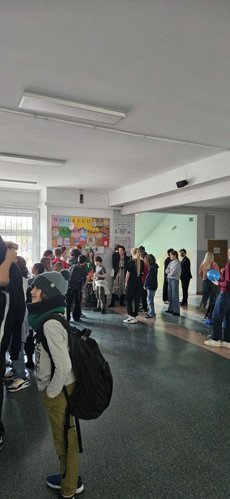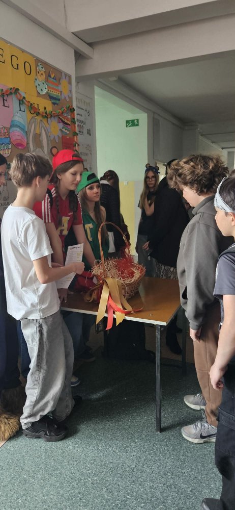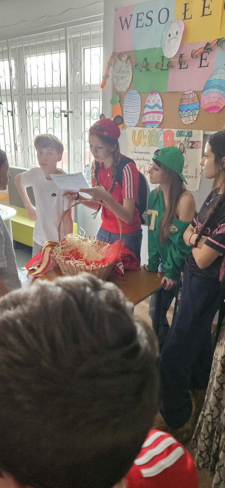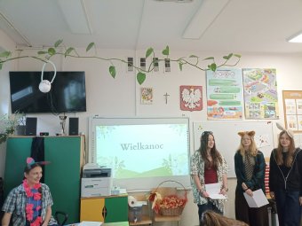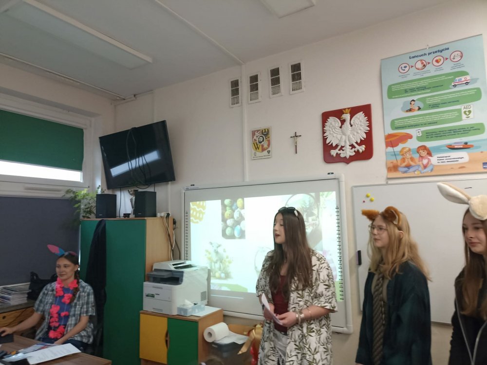 Pokazali im przygotowana specjalnie dla nich prezentację o tradycjach Wielkanocnych i poczęstowali słodyczami. Zarówno uczniowie klas starszych jak i młodszych chętnie angażowali się w zabawy.